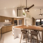 The kitchen accommodates bamboo cabinets and white quartz countertops. An irregular-shaped island with a walnut butcher-block counter provides a roomy space for informal dining. The butcher-block countertop falls down creating a seamless, continuous look.