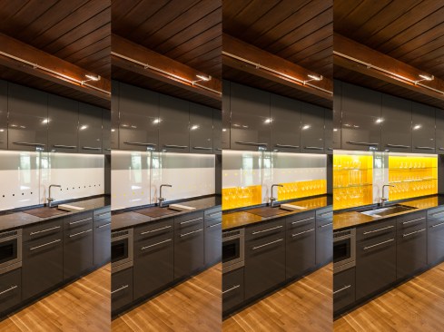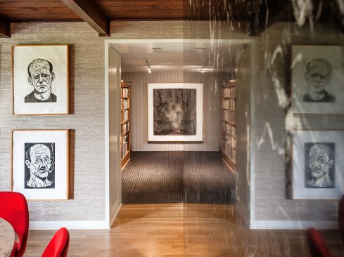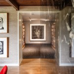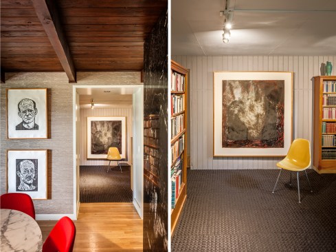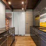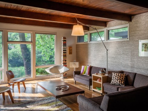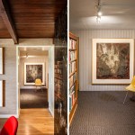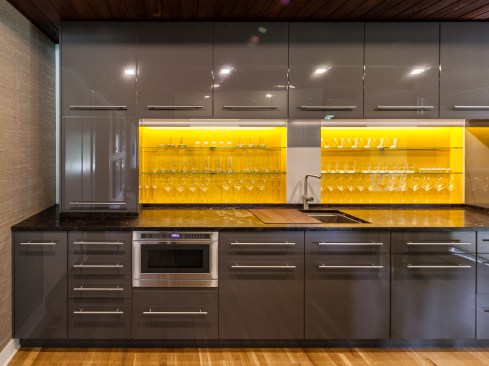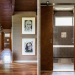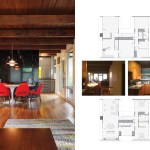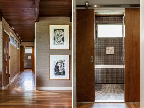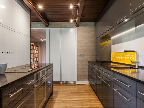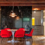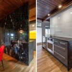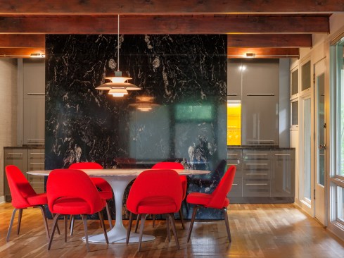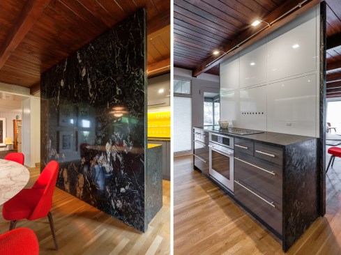 Built in 1956, this mid-century home was purchased in 2000 by the current owners, who wanted to return it to the spirit of the 1956 home, with a kitchen and bath that would fit their current needs. The back courtyard of the original H-shaped plan had been enclosed by the previous owners, and the space had been divided with multiple carpet and tile types. The renovation moved the stair from the living/dining/kitchen wing into the back courtyard space and extended the kitchen across this widened space. Dividing the kitchen from the dining room is a book-matched granite wall that nods to Mies, and creates a new focus for the living/dining space. The kitchen is designed to have a daily kitchen mode, with epoxy painted steel backsplash doors, which open vertically to reveal glasswork cabinets in bright yellow, ushering in an entertainment mode. The kitchen side of the granite wall is finished with epoxy painted steel as well, with the downdraft fan integrated into the wall. White oak floors were extended into the kitchen and the former stair space, and were exposed and refinished in the balance of the house. Two very small former bathrooms were opened up to create a larger glass-tile clad bath with floating mirror-doored custom cabinets and rectilinear white plumbing fixtures. All changes, along with the grass cloth wall covering, were designed to feel as though they may have been original to the home.