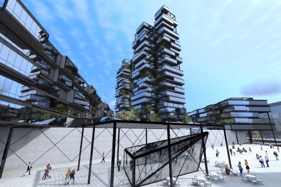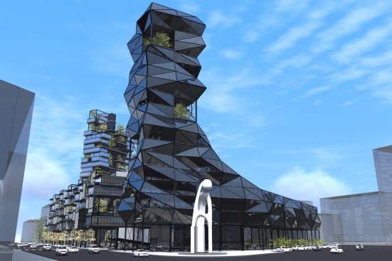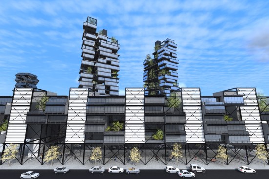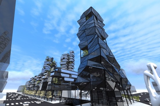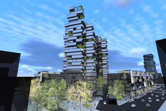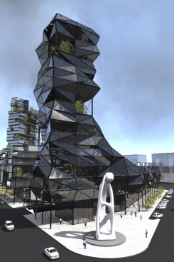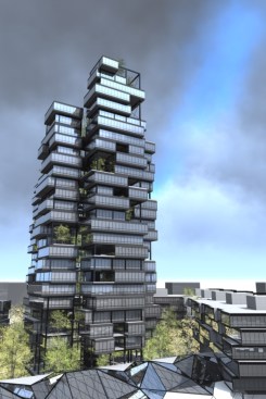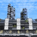The office building emulates a living creature, crawling towards the corner of the street and straightening up at the destination. It looks only natural within the whole complex, as it is obvious how important the organic aspect is to this piece of architecture. On the opposite end of the complex stands the apartment building, construction of which is based on the idea of variations: every floor differs in terms of a garden placement and no apartment is designed the same way, but these differences still make them part of the one aesthetic. In the middle section of the building are 3 elevators and the staircase, which enter the spacial areas with greenness. Between this tower and the office building stretch two lower buildings, incorporating offices and apartments and are also built with concept of variation.
