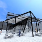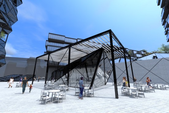 At the feet of the office building lays an open area with a cafe and beside it is the shopping valley, connecting 2 streets diagonally.