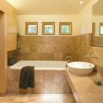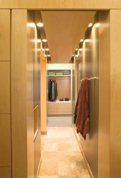 Clean, modern, and sleek is how the judges describe this bathroom/closet remodel, and that’s exactly the effect Brown’s clients were after. Materials and finishes throughout were kept natural and simple. Maple plywood storage in the closet and bath blends with the mottled-putty limestone tile that blankets the floors and wraps up the bathroom walls, forming the counter surface for the white china lavatory and the tub surround. “The continuity of the tile unifies the space,” Brown says.