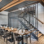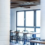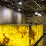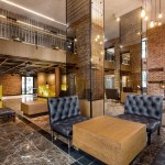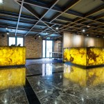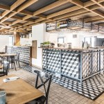 complex. It was erected in the place of a former garrison laundry, transformed then in cocoa and almond paste manufacture. The author of the interior design, Paulina Czurak – owner of the Ideograf Architectural Studio – consequently tried to discover numerous references to the history of that place. The hotel part consists of 109 rooms and many common areas. In the lobby, stone tops made of onyx draw attention, and they refer to the traditional amber of Gdańsk. On the floors, there appear fitted carpets with the map of Gdańsk printed on them, designed specially for the Hotel. These are just few elements out of many which add a unique character to this place. In the restaurant part, thanks to the live-cooking concept, the guests are given the chance to observe techniques of cooks’ work. This is a culinary way to make business and private meetings more attractive. The two-level restaurant is divided into two zones: the lower one where the bar and the kitchen are situated in the centre, and a more cosy zone on the upper level.An additional attraction, thanks to the unique situation of the Hotel, is the window view of the yacht marina.The industrial character is added to the interior by suspended shelves and the structure of the bar, on which there are tiles with geometric patterns, which smoothly join the oak pavement. The composition bridge supplementing the wood motif in the interior is the wooden grate on the restaurant ceiling. A similar element is also found in the lobby