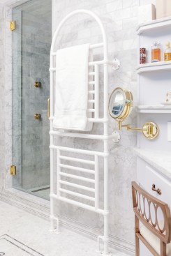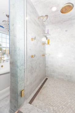 Project Scope: Our clients wanted us to transform a large empty room on the second floor of their home into their dream bathroom. We integrated a large shower space which included a steam unit, conventional shower head, rain head, hand shower, and multiple body sprays. We also incorporated into the design a 6’ long heated standalone tub unit, his and hers matching vanities on freestanding leg systems with custom made Carrara Marble countertops, as well as many custom made build-in’s, paneling and trim. The floors, walls, and most trim is Carrara Marble tile. We also roughed in a future bathroom in the adjacent space for future use. Objectives: • Integrate many unique features and fixtures into a tight floor plan space. • Create a luxurious steam shower design with a large bench, various shower heads and body sprays. • Create a custom makeup station with cabinetry built on site. • Build custom linen storage cabinetry on site • Install custom made Carrara Marble stone inserts in front of each vanity. • Install custom ordered hydronic towel warmer on outside of shower wall. Challenges and Solutions: • The house was built in 1822, which created many unique challenges during this remodel. The floor and ceiling were extremely out of level. We had to build up the existing floors and ceilings with tapered framing members to create a level surface to work with. • The space we were working in was a large empty space that did not have any existing plumbing in it. All of the plumbing for this new master bathroom had to be creatively run through the existing house, requiring us to build chases on the first floor and reinforce a great deal of floor framing to allow pipes to be run to and from the space. • The existing plumbing and electrical infrastructure in the house were not adequate to support all the features of this new bathroom. We updated both services as a part of this project. Two separate on demand water heaters were installed in the basement, one was to provide the needed hot water for the new shower and all of the new features, the other was to supply the water for the hydronic towel warmer and radiant heat loop in the shower floor. • Because of the tight space, we had to come up with some creative methods to house the mechanical components. The steam unit was built in under the bench in the shower. The turbine motor for the jet tub was housed in a custom built-in night stand in the adjacent bedroom. There is a removable wall panel on the back side of the shower plumbing wall that allows access to the electrical components of the shower control system. Results: Our clients are very happy with their new master bathroom. We were successful at incorporating all of their wants and needs into the space and they are enjoying it daily. The bathroom serves as a spa like retreat for the family; whether lounging in the heated jet tub, enjoying a luxurious steam shower, or comfortably applying makeup at the custom built makeup station, this bathroom is truly a great escape for our customers. We are extremely proud of how this project came out and look forward to a continued relationship with this valued customer. Final Description: We truly value our Design Build Process which provides an exceptional experience for our clients. By taking the time before construction even begins, to plan design, to make product selections, to use 3D design software and to provide a fixed cost, the process of actually renovating the home goes much smoother with very few change orders. Our clients value our expertise at the beginning of the process and as unforeseen circumstances arise. We thoroughly enjoy being able to help make someone’s dream for their home a reality and we strive to accomplish this with the least stress possible on them.