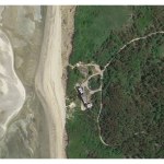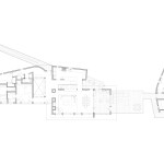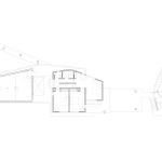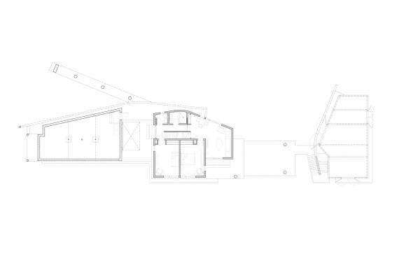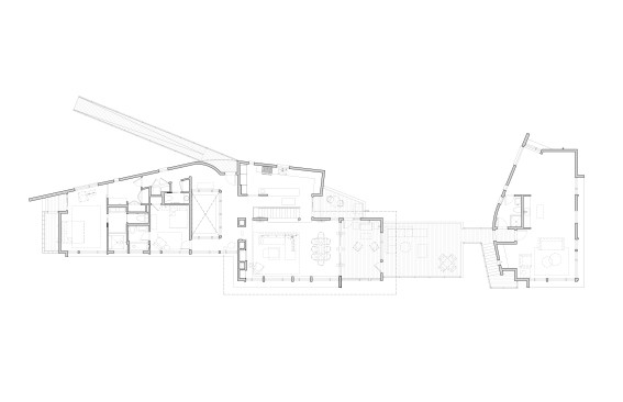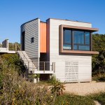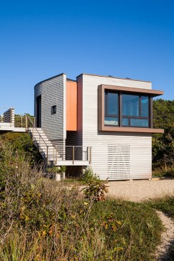 The main house is conceived of as a collage of overlapping, cantilevered planes and volumes that culminate in a large living / dining space defined by an asymmetrically arcing copper roof plane. Entry to the house is by way of a long ramp through what will in a few years be a thicket of native pines and bushes, then through curving cedar shingled planes. The inland side of the house is tucked into its shifting, sandy landscape and is comprised of cedar shingled planes that float above the ground and contain bedrooms, bathrooms, and the kitchen, and lower volumes of horizontal tongue and groove cedar boards that enclose bedrooms and a gathering space for teenage sons. On the Cape Cod Bay side, the house opens up through walls of glass to endless water views and heavenly sea breezes. In the middle of the house, just inside the front door, is an architectural “hole” that allows the house to breathe and cool itself naturally most of the year through its floor to ceiling awning windows, and which also provides views of the sky from a shady breezeway on the lower level. Along one wall of the hole is a trellis planted with evergreen and seasonally aromatic flowering vines.