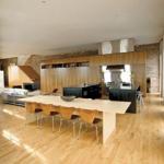 Dumez defined the lighter-function areas of the kitchen wall with wood and the heavy-duty cooking area with stainless steel reaching up to the ceiling. “I wanted to keep the ceiling plane as clean as possible,” he explains, “so except for lights, the only thing that pierces it is this one stainless piece.” Dishwasher, fridge, and microwave are all integrated into the cabinetry.