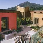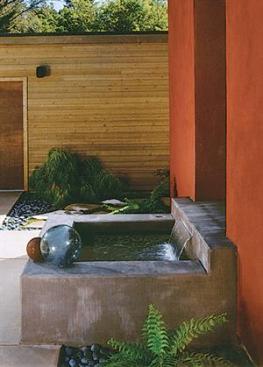 A steep and somewhat treacherous mountainside site led architects Steven House and Amena Hajjar to develop a courtyard plan that wraps a serene, Japanese-inspired garden. During the day, the house reaches out to stunning views of Mount Tamalpais, just north of San Francisco, but at night activities turn inward to the courtyard. The owners wanted the sound of water to draw people into the space. The sound of the rushing water echoes off the three walls enclosing the courtyard, evoking a “Zen feeling that’s not overpowering,” Hajjar explains. A concrete extension of the dining room window sill, the 7-by-5-foot fountain occupies center stage in the courtyard and can be seen from the great room, the daughters’ bedroom, and a hilltop spa opposite, as well as from the dining room. “I wanted the waterfall itself to be a visual plane—to make a statement that’s as strong as the building,” Hajjar says.