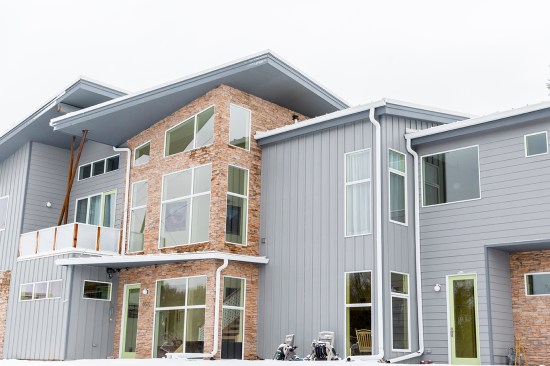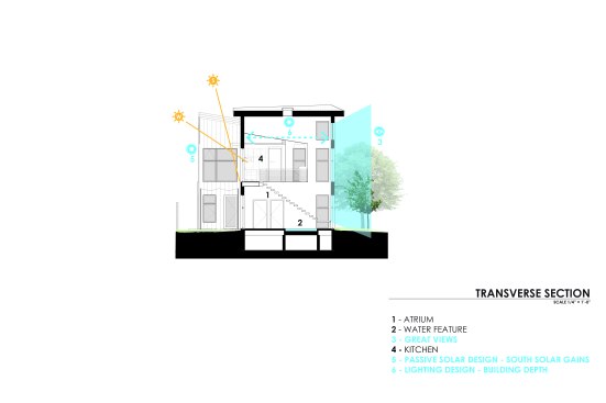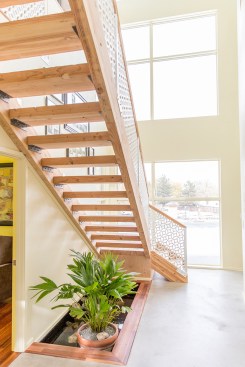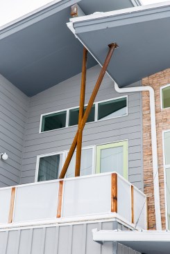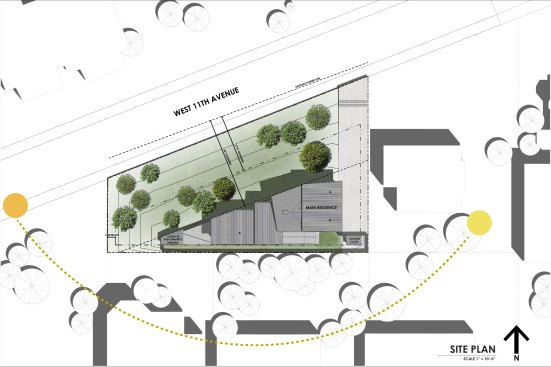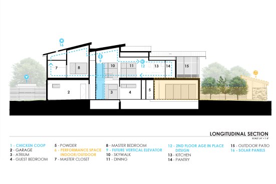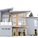 Jazz house was designed in 2013 for 2 tenured veterans of the United States Army, Kimberly Rieniets and Chad Schneider. Kimberly and Chad contacted us with a very unique program for designing their new home on an empty and irregularly triangle shaped lot that was nearly unbuildable. The front setback of 60′ and the rear setback of 15′ forced us to petition for a variance via hardship to allow the setback in the rear to only be 5′ in order to make the lot buildable. We were successful in our endeavor for this variance and the city of Lakewood has subsequently used it as an example for successful spot zoning. As mentioned, their program for design was unique to say the least, both Kimberly and Chad were encumbered with a degenerative joint disease affecting their feet, knees,and backs which impaired their ability to use stairs, restricted their walking distance, and impaired their joint range of motion, due to their services in the Army and required the design to be fully ADA accessible as they aged in place. On a typical shaped lot with plenty of room this would be an easy task but due to the setback constraints and irregularity of it’s shape we had our work cut out for us. A future spot for the elevator also had to be taken inconsideration to make sure they could age in place easily. Chad, a Jazz musician, also required a music studio for practice and the ability to entertain a small crowd privately. Finally, both clients expressed to us their desire to create a home that would be unforgettable to the public and their private guests. Something unique, unforgettable, and visually striking. What resulted from these design parameters and site constraints is the “Jazz” house. One of the most unique contemporary homes in the greater Denver metro area. As one arrives at the site of the home, the form of the house arises from the ground as if a musician is tapping upon piano keys. The varying roof-lines are a reflection of the musician and music to be found within while the scissor and v-columns dance along to the architectural melody. The floor plans then mirror the shape and height of the house, while stepping back to meet the setbacks. The main floor consists of a 2 car garage with the doors facing away from the street for a private and discreet entrance. Center right of the garage is a 2-story foyer with water feature, open tread stairs, and an abundance of natural light throughout. Moving further rightward is a junior suite with living room, bedroom, and of course, Chad’s studio. The studio features a glass garage door that opens to the outdoor performance area and studio. The upper floor is unique in that most of the public space is located on this floor, the kitchen and living room. As you ascend the stairs to the top of the sky walk moving leftward is the master-suite, laundry and private balcony. To the right of the sky walk one is met with the indoor dining room, living room, kitchen, and finally, the outdoor dining room that overlooks the outdoor performance area below. Since the occupation of the Jazz house in early 2015, Kim and Chad have been nothing short of thrilled with their dream home. Lastly, we were able to accomplish all of this with a modest budget of only $230 per square foot.
