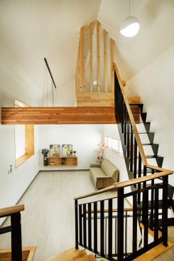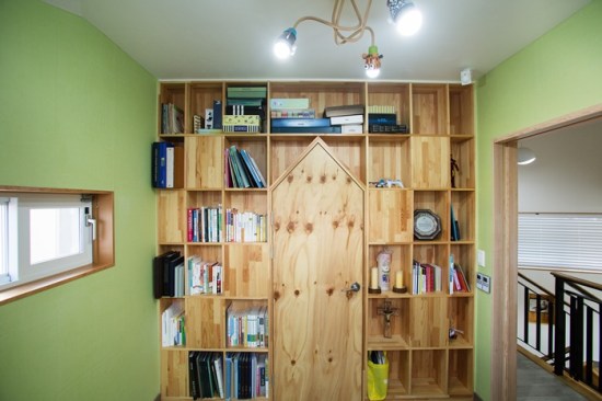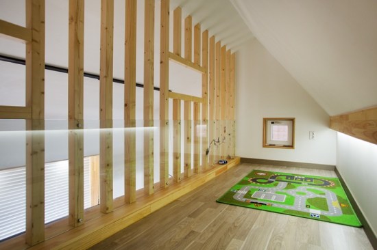 Second floor attic are located in above living room. The living room, children’s room, and library are each other go up and down.