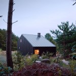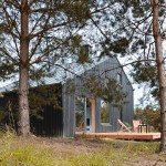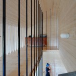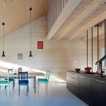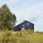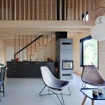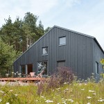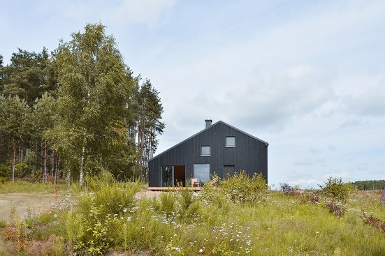The house is built using a wooden skeletal construction. The elevation is covered with pine boards, a natural material traditionally used in this part of Poland. The exterior of the house is dark and therefore matches its environs in a harmonious manner, while in contrast the interior uses wood in its natural colours. The irregularly positioned windows allow daylight into all of the rooms and frame the views of the surrounding landscape.