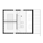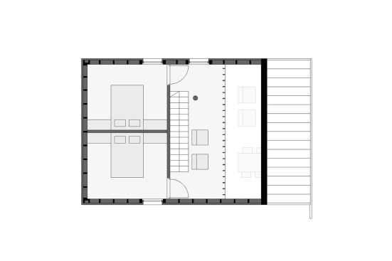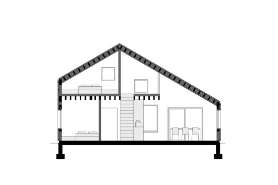 As a large part of the site is covered with trees, the house was designed with a compact shape. Its asymmetrical form is a result of the functional arrangement of the interior. In spite of the limited size of the house, it proved possible to organise a spacious day zone on the ground floor comprising living room, dining room, and a kitchen annex with direct access to the terrace. The staircase located in the centre separates the living room from the hall and from the closed rooms: the main bedroom, bathroom, and toilet. The asymmetrical roof allows sufficient height in part of the building for an additional floor with mezzanine and two guest bedrooms.