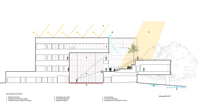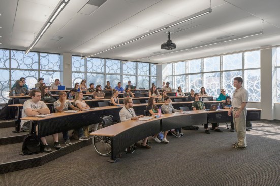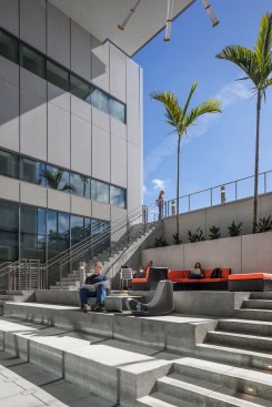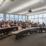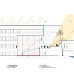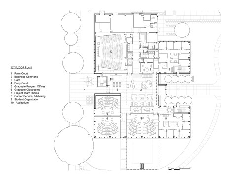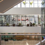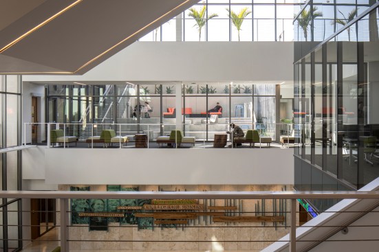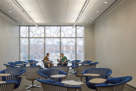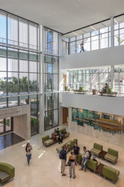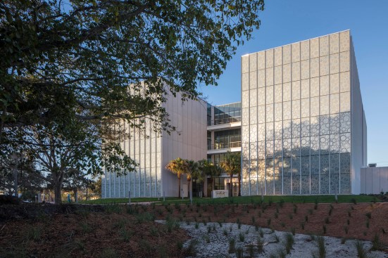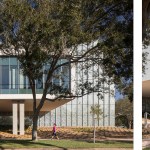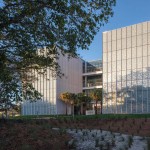 Conceived as an ‘athenaeum for business scholars’, the three story, 68,000 square foot structure takes inspiration from its Tampa Bay setting and the indigenous coral stone. Like the stone, the building is a porous container with openings carved out of its volume that house various program elements and allow sunlight and landscaping to penetrate deep within the structure’s core. One of these openings is a Palm-lined courtyard with seating that supports learning at the building’s entrance. Other openings house a light-filled central commons and an adjacent scholar’s garden that support casual learning and encourage productive collisions to occur between students and faculty as they move through the building. The multi-story commons and scholar garden are spatially intermeshed and ringed with active programs spaces including a trading room, community room, break rooms and classrooms that connect the learner to his or her environment. The most unique feature of the building is its glass façade that metaphorically recalls the openings in regional organic coquina or coral stone albeit in an abstract and hyperbolized manner. To achieve a three dimensional impression and depth of surface, such as one would find in coquina, the design team created an inventive composition of glazing units that make a flat glass surface appear to have depth and dimension. The composition is made of a ceramic fritted first pane that is double run with two tones of a circular pattern. The second pane is reflective one way mirror glass that allows view out but reflects the patterned ceramic coating of the first pane outward. The result is a glass surface that has a three dimensional quality or a shadowed depth that belies its constructive flatness. In addition, the glazing system is designed to resisted hurricane force winds and projectiles and reject the intensive Floridian heat gain. This project is a joint venture partnership between ikon.5 architects-Princeton, New Jersey and Harvard Jolly Architects-St. Petersburg, Florida