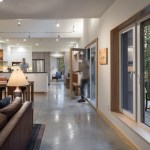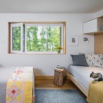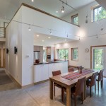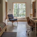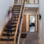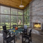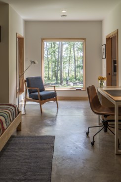The exterior is visually quiet and blends into the forested lakeside setting and community aesthetic standards. The interior is a modern, open plan with living spaces facing the lake on the south, and mechanicals systems occupying the north. An outdoor room with fireplace integrates indoor and outdoor living. The surrounding forest is selectively pruned to provide filtered views to the lake, improved solar gain, and to allow natural light and air flow. The new home meets the rigorous Passive House standard ensuring the most comfortable and healthy indoor environment available. A future roof mounted PV solar system will make this home net zero energy.