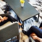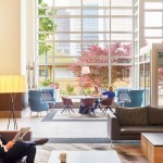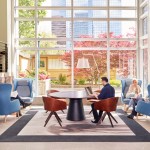 The existing lobby, a sprawling 8,100-square-foot series of contiguous spaces, lacked definition; seating was uncomfortable, and there was little reason to linger any longer than necessary. Transforming the space required reimagining how the space could be used. A survey of building tenants revealed an interest in alternative casual meeting and work spaces. The design solution was to treat the lobby as a series of seven rooms, or stage sets—merging notions of work and hospitality—that were connected through color and seating arrangements. “It was as simple as creating spaces where people actually want to go,” notes Shannon Gaffney, design principal for the project.