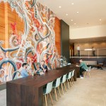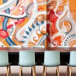 Pops of color are found in furnishings and selected interior surfaces. Most notable is the giant “wall tattoo” spray-painted onto an existing wood paneled feature wall. The low-cost effect makes a bold statement and helps to give focus to the lobby. Equally cost-conscious is the James Turrell-inspired ceiling in the elevator corridor, achieved with paint and simple fluorescent fixtures. Color is used to dissolve material surfaces creating an etherial portal to the offices above.