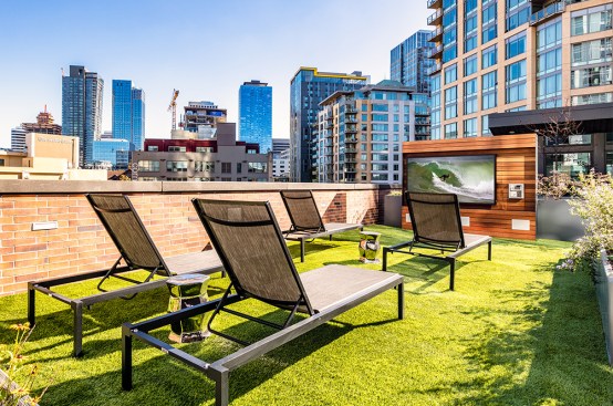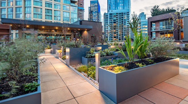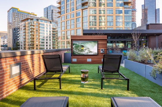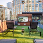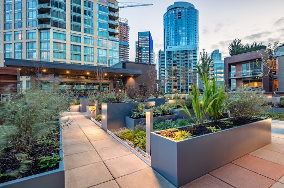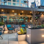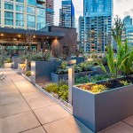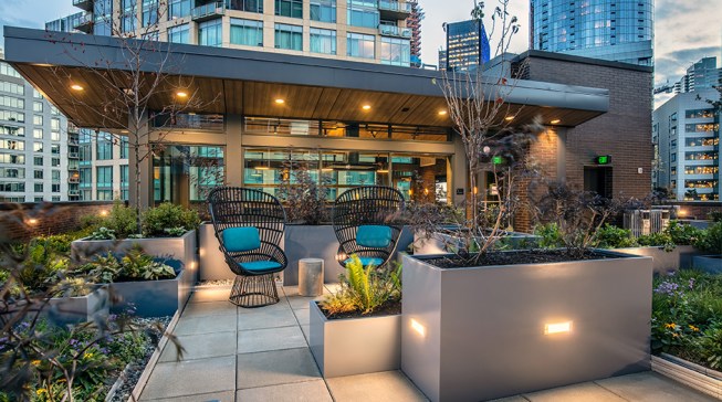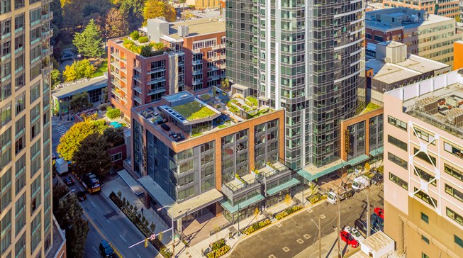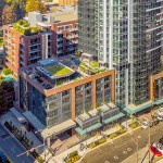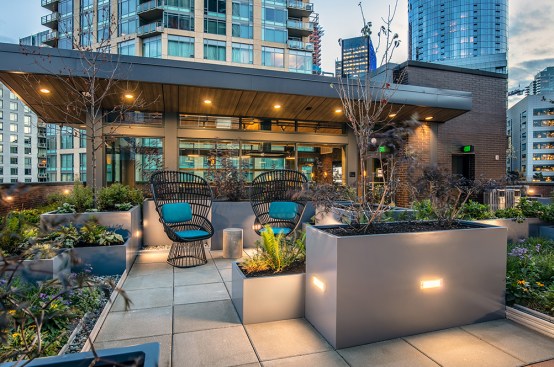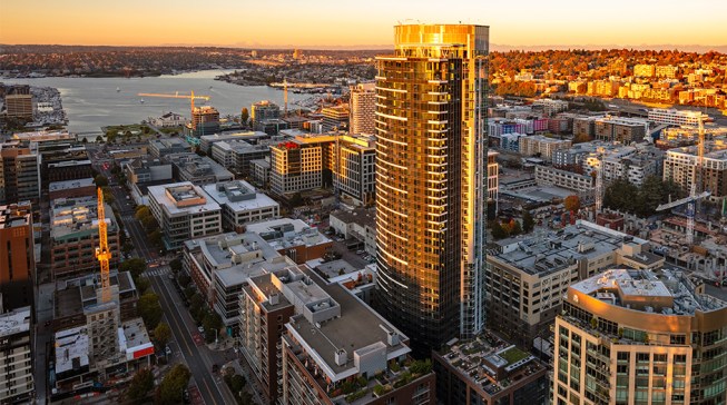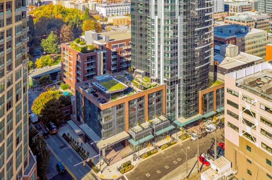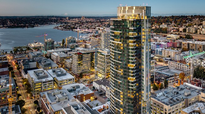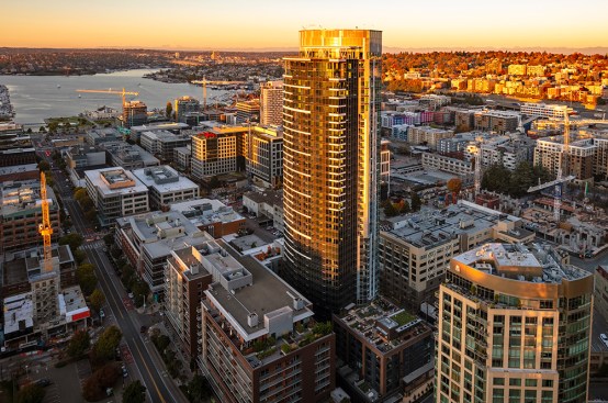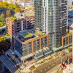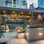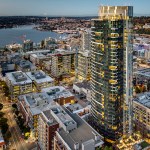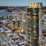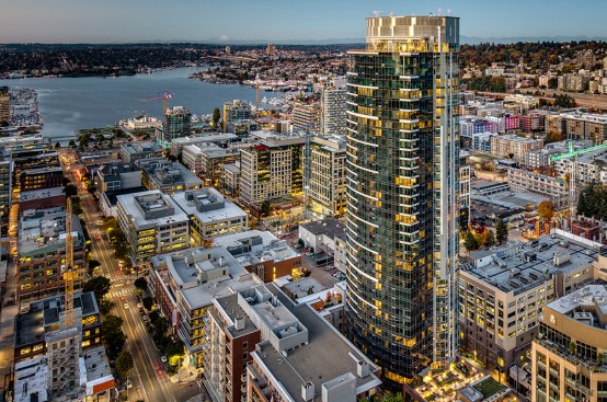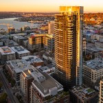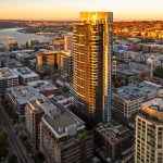 The tower is composed of two major, contrasting vertical elements that help to slenderize and break down the mass into an elegant, layered composition of alternating glass colors. The top of the tower is terraced and sculpted, and the roof top itself provides an additional roof top garden and owner’s lounge where spectacular views of Lake Union, The Space Needle, Elliot Bay can be enjoyed by residents.