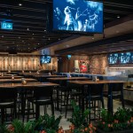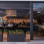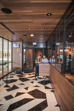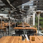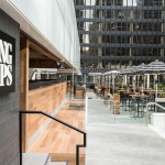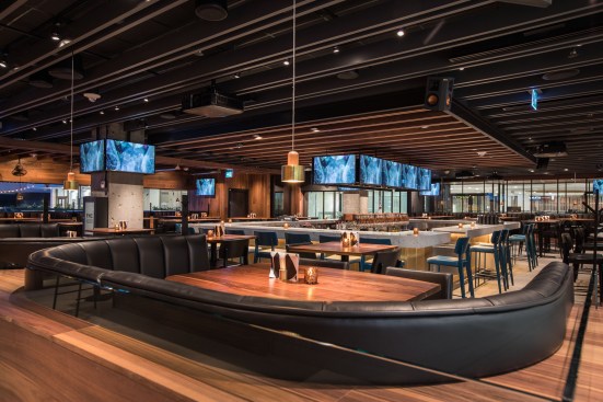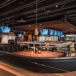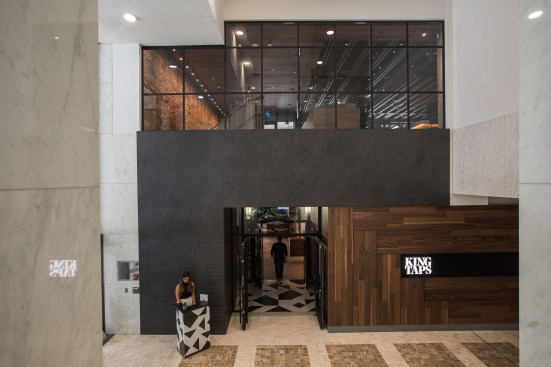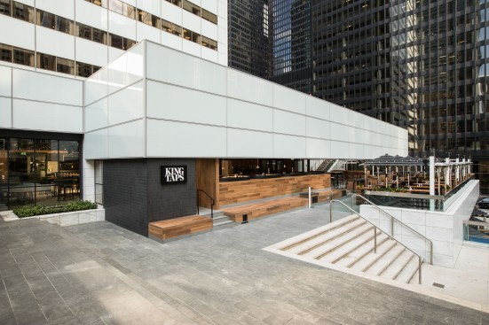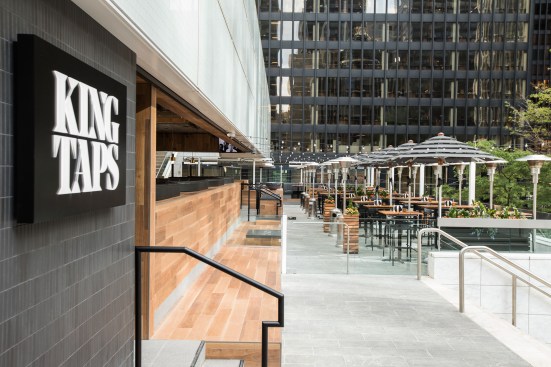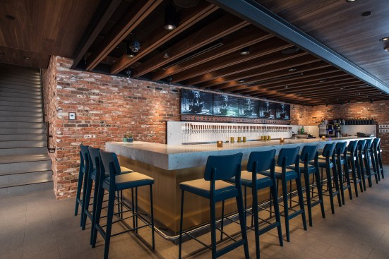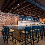 King Taps is Toronto’s newest restaurant and bar in the heart of downtown Toronto’s Financial District in the First Canadian Place building. At 10,400-sf and 450-seats, King Taps features two levels, two bars and two patios sprawled out over two stories. Assembledge+ designed the spaces with a refined palette of black walnut, slate, artisan tile, reclaimed brick, Carrara marble, steel and brass. Furnishings include butcher-block walnut tables, black leather seating, brass pendant lighting, and accent bar stools. Pops of art include Anser’s signature face and a silver-plated bronze sculpture by Belgian artist William Sweetlove. State-of-the-art technology has been infused in every detail, from the screens and booths that are equipped with USB and electrical outlets, to the kitchen, featuring pizza ovens and sophisticated beer tap equipment. The key to the restaurant/bar was to maximize opportunities for open-air dining with sliding glass panels to accommodate weather year-around, while taking in the views and also engaging all the energy and action of the community.
