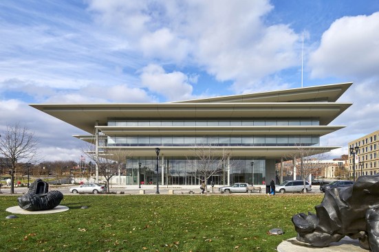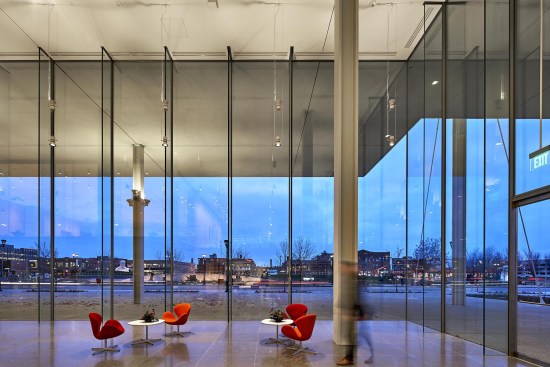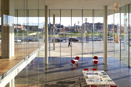 The location provides all the amenities of a vibrant city within a couple blocks; a mix of corporate, retail, residential, cultural, and culinary sites. In addition, the site is across the street from one of the most important aspects of a downtown core – an urban park. A mix of historical and contemporary buildings surround the Pappajohn Sculpture Park which was immediately considered as an extension to the project site. The adoption of the sculpture park, study of the elevation change between Ingersoll St. and Grand Ave., and the value of civic engagement shared by both Kyle Krause and Renzo Piano Building Workshop all lead to the concept of transparency and openness at the street level. The effect is that the building is not a barrier but instead fosters a literal two-way dialogue between the associates who work within the building, the public, and the city. The experience on the office floors above is also enhanced by the virtually invisible façade which allows unobstructed 360-degree views, as well as the extra-long overhangs which protect the interior spaces from direct solar radiation.