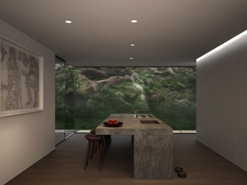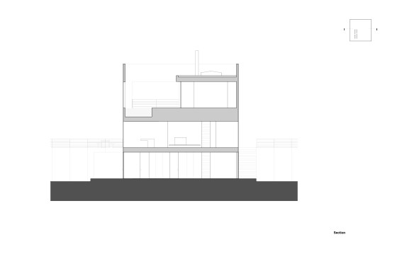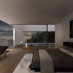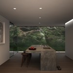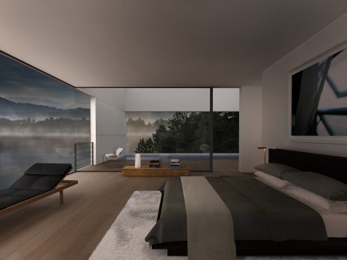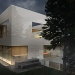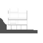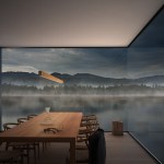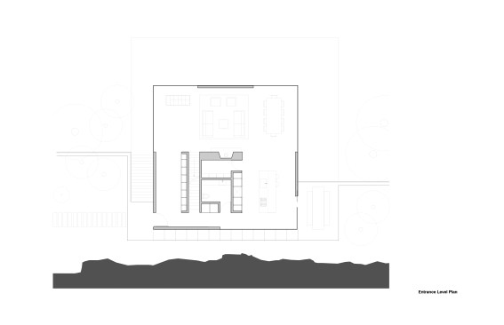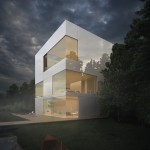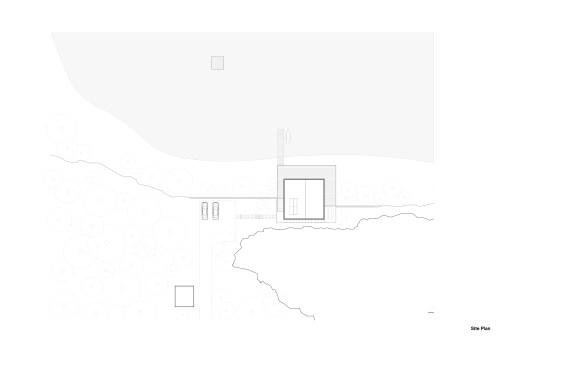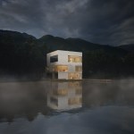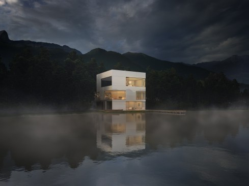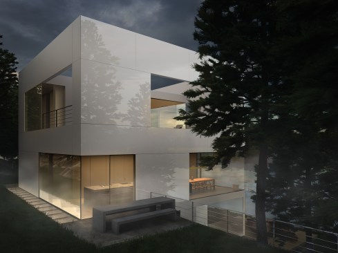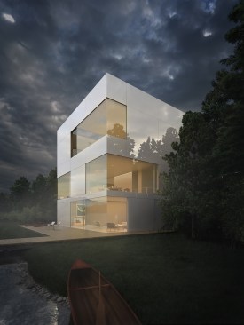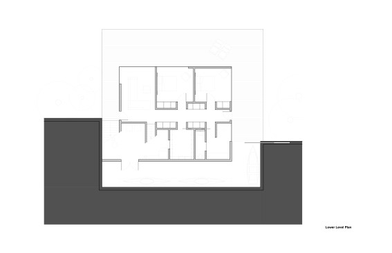 Located on Longacre Lake in Bethlehem, Connecticut, this weekend retreat house was conceived as a cube embedded in the steep embankment of the lake. The house is a perfect square in plan and elevation with a seamless transition between opaque and transparent glass facade and voids. The lower level of the house, which contains guest quarters, boat storage and the media room, is embedded into the embankment and allows for access to the house at the second level, where the living room and kitchen have panoramic views over the lake. The upper level houses the master bedroom suite and outdoor swimming pool. Similar to a Rubics cube the portion of clear glass to opaque shifts in the same proportion between floors, affording new vistas as one traverses through the building. The internal stairs are stacked and require that the occupant to pass through programed space as they ascend through the house. The house has access to the outside at every level, the lowest level being at the height of the lake shore, the entry level with gardens along the embankment and the pool deck on the upper level.