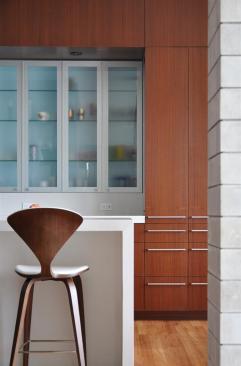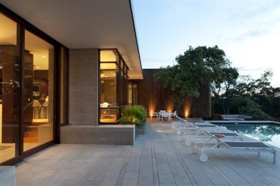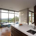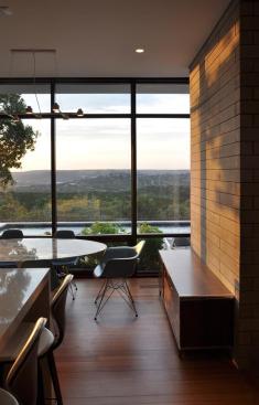 The clients loved the idea of a modern house with spaces flowing into each other. Maximizing the view was important, too, so the architects at Alterstudio oriented the kitchen to overlook a wildlife preserve filled with big old oaks, the land sloping down to the banks of Austin’s Colorado River. Mitered corner windows appear to make the junctures in the panes almost melt away, giving the room even more of an expansive feel. (For a thermal layer on the corner pieces, laminated panes, rather than double ones, were used.) Natural light flows through the room, thanks to an uninterrupted ceiling plane. And due to its generous sense of openness, there’s not usually much need to turn on the lights during the day.
