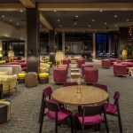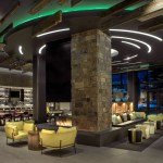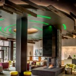 The overall design theme is the establishment of the hotel as a community “base camp” in which guests can start and end each day. In public spaces, the concept was executed through design of a large, centrally located seating area focused on a monolithic stone fireplace hearth, dubbed the “campfire.” The relationship of the fireplace to an overhead design installation utilizing fiber optics and linear, radial and cove lighting replicates the experience of walking through a forest and emerging in a clearing below a starry night sky. The outdoors was further embraced via an architectural, overhead, reclaimed wood trellis detail that moves from the porte cochere, into the lobby, and onto a plaza.
