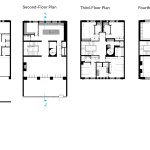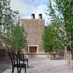 The house’s simple plan is efficient, with a central hall and stairway topped by a skylight and living spaces located on the northwest and southeast sides to maximize natural light. Interstitial zones hold services, including a second means of egress (condensed as a spiral stair behind closed doors), and storage. Common spaces are clustered on the second floor, with a living room that opens onto a small private backyard and a semi-private park that’s shared with the neighboring townhouses and a related high-rise. The third floor contains the house’s four bedrooms. Two outdoor rooms defined by the core and party walls comprise most of the fourth floor: The front northwest-facing room features a kitchen garden while the rear southeast-facing outdoor room is a living space with a fireplace.