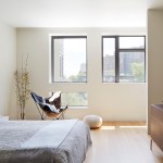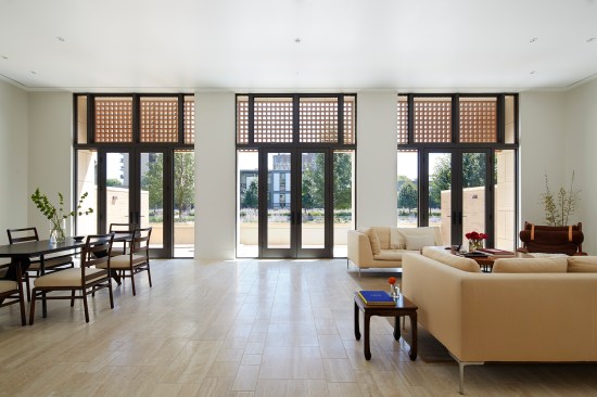 The palette is constrained, balancing the interests of the clients and the architect in expressing both vernacular and modern touches. Travertine tile floors, white plaster walls, and oak doors and stairs provide most of the interior material interest. On the exterior, the challenge was how to be a good neighbor to the rest of the development, which is a new series of traditional-style townhouses spanning half a block. The architect’s answer lay in gridded masonry that gives a material sense of the bearing wall’s construction with a bit of abstract expression of the traditional Venetian palazzo—a typology that famously balances symmetries with asymmetries. “I don’t like the approach of randomness,” Lasher says. “I believe there can be a liveliness to formalism.” The post-and-lintel system utilizes buff-colored Minnesota dolomitic limestone. Metal-clad wood windows alternate with infill sandstone panels, whose natural graining and patterning brings variation to the façade.