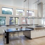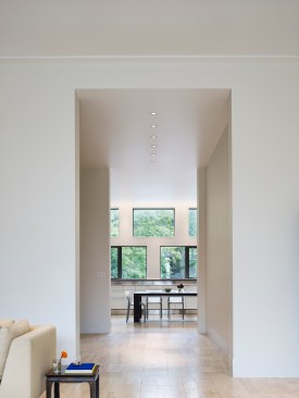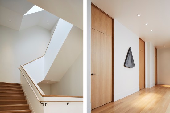A simple interior palette of light stone and wood floors with bright white walls and ceilings establishes what the architects call “a non-historical expressive language” that seems both modern and vernacular. While solving the constraints associated with the classic double-party-wall townhouse typology, the designers have drawn on a sophisticated use of space, including extensions into the exterior at the second and fourth levels, to create a home that seems more like a freestanding single-family residence. —Edward Keegan, AIA