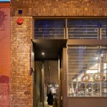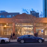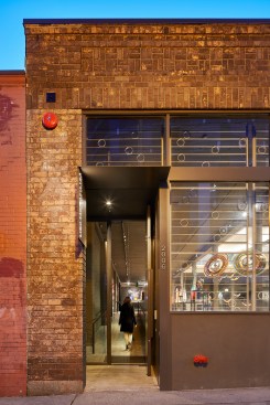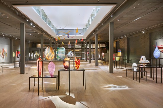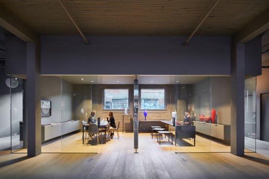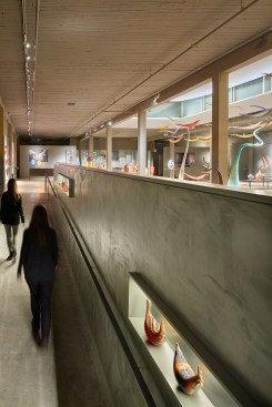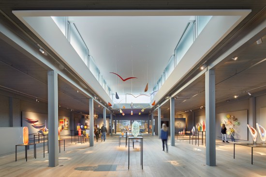 Most recently serving as home to an auction company, the studio occupies a 1917, one-story, masonry and heavy-timber-framed warehouse building, which presents a quiet presence to its urban setting. The entry is defined by a large wood-and-steel door which incorporates a modest illuminated cut-steel sign announcing the venue. Inside, the entry opens onto a sloping interior ramp which parallels the studio itself, which is essentially one large, 6,100-square-foot space. The brick interior has been painted matte gray, while floors are made with a subtly bleached white oak. Overhead, a 16-foot-wide-by-45-foot-long light monitor floats above the center of the space. Translucent clerestory glazing brings daylight into the space. The underside of the monitor features a curved soffit that softly shapes the daylight that fills the space. The client refers to the light-filled space created by the monitor as the cube. The cube serves as an illuminated volume in which to hang large collections of glass pieces or to feature tall works. Indirect light sources inset into the monitor provides dramatic lighting in the evening.