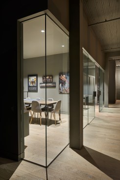 Details within the space are kept to a minimum and serve as a quiet counterpoint to the art and the elemental materials inherent to the building. Support spaces, including a glass-fronted office and conference room, restrooms, kitchenette and storage, round out the functions on the main floor. Custom-designed Europly cabinetry and hot-rolled steel and Europly furniture fit out the spaces. The conference table is built from fir beams reclaimed from the building construction. Elemental steel display stands of various heights and steel wall and ceiling mounts support the art.