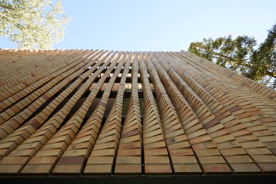The screen is made from a series of torqued columns, each formed by stacked Chicago common brick. “It’s the throwaway brick,” Scarpa says of the locally produced salmon and buff masonry units that owe their unique colors to the region’s clay. “People always put it on a building’s side, where you never see it.” But Scarpa is known for taking materials often seen as junk and transforming them: “Just because it’s not perfect, doesn’t mean it can’t be beautiful,” he says.