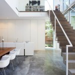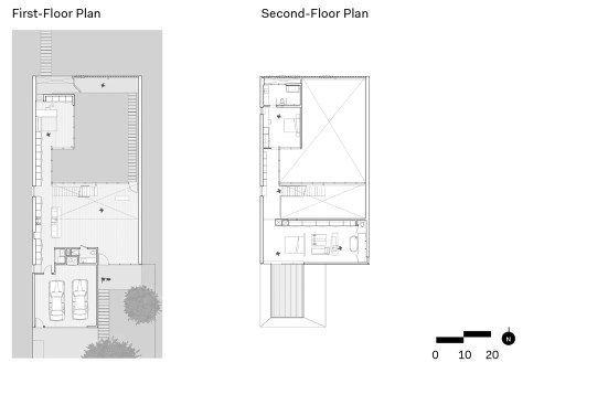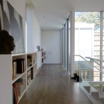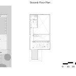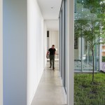 The structure’s open floor plan is quite simple, with a double-height great room that accommodates living and dining areas immediately adjacent to the courtyard. The kitchen shares the same space, with its appliances tucked into white millwork along the west wall of the house. An office occupies a small pavilion on the western edge of the courtyard, and it is linked to the living spaces via a glassy corridor. Upstairs, a large master suite anchors the rear of the house, and a small guest suite is located above the office.