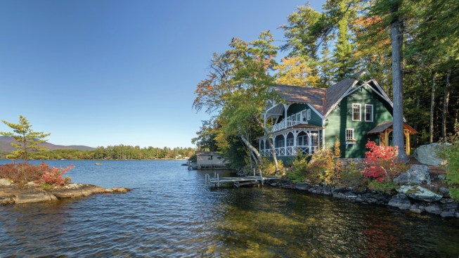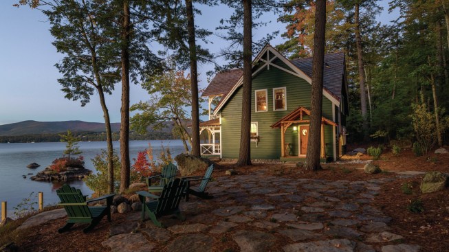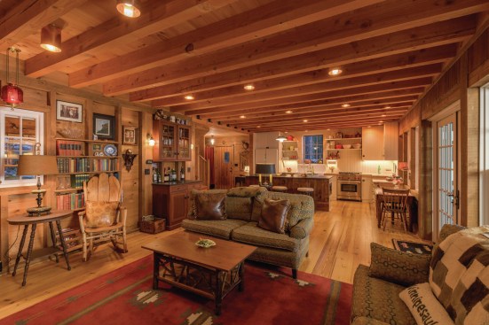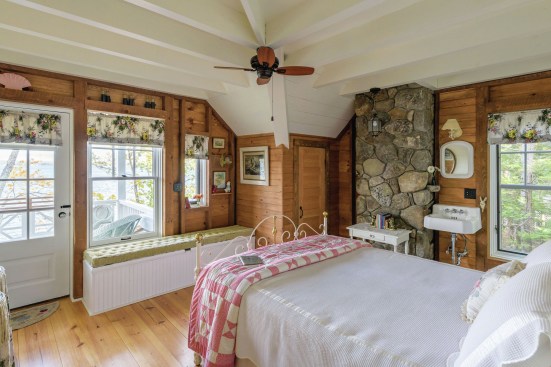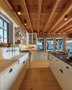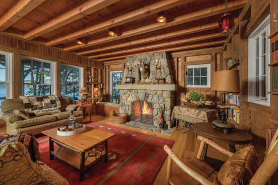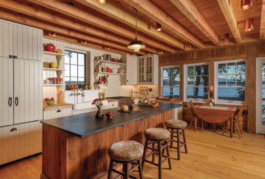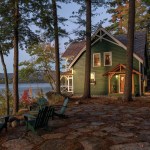The client purchased property on Lake Winnipesaukee with 250 feet of shore frontage. It included a small building seven feet from the water. The building was an original fishing camp which was built in circa 1920 and was 28 feet by 32 feet with a loft, a small fireplace and a porch facing the lake. The building had three small additions added over time. The first was a bedroom added to the east; the second a kitchen to the west; and finally an addition to the south with a small bedroom and bathroom. The client loved the rusticity of the original fishing camp and its proximity to the lake, but wanted a much larger building. The Architect explored options for expanding livable space while preserving the feeling of the historic lake camp. The client’s family owns other historic camps nearby. The design solution allowed a modest expansion of the nonconforming footprint which is totally inside the lake setback zone. The town required that the building had to be renovated and could not be torn down. The building was lifted and the renovations kept the original floor system as well as two exterior walls. A second level was added including an upper level lakeside porch above the main level porch. In order to minimize impact to the trees at the water’s edge, cantilevered cast-in-place concrete beams were built into the foundation to support the two lakeside porches. The client wanted the new “cottage” to look and feel like an historic camp. The resulting 1,976 square foot home includes exposed framing at exterior walls and historic styles of paneling in all rooms. The project includes historic sinks which were refinished as well as many historic light fixtures, purchased by the client, which were rewired to meet current requirements. The client selected the furniture for the project and worked closely with the architect and contractor on interior finish selections. Some of the original loft flooring was incorporated into the kitchen island. Despite the interior exposed framing, the exterior walls are insulated outside the sheathing with several inches of rigid foam providing a very efficient insulation with continuous insulation bridging the structure. The roof is insulated with closed cell foam and the crawlspace is also insulated. The landscape is mostly planted with native shrubs and locally sourced stone for patios and water channels to direct water toward a rain garden for eventual dispersion.