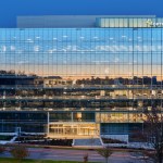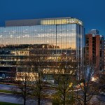 To achieve the quiet and rational nature of the design, the office building is wrapped in a clean stick-built curtain wall, deploying a range of vision glass, shadowbox, and metal panel, delivering a subdued tailored mass. The glass façade parallel to Little Patuxent Parkway is skewed slightly. As a result, the office building takes on a gentle trapezoid shape, that slightly points towards Wincopin Circle for a more slender glass elevation on the South side. The residential building, in stark contrast with the office building, is mainly composed of a warm color brick, dark metal panel, and glass wall. The L-shaped building, with the narrow West side connected directly with the office building, attaches only at the lower level via a shared egress path. Both buildings meet at the same height level, topping out right below the maximum height of 120’-0”. To showcase the complex relationship between the building components, each of the residential building corners are composed of a floor-to-floor glass wall to pick up the simplicity and lightness of the office building. Offering uninterrupted views of the lake on the East side, the residential building is branded as “The Lake House” to reflect the proximity and influence of Lake Kittamaqundi. The primary office space tenant is Optum. Howard Bank opened a branch on the ground floor.