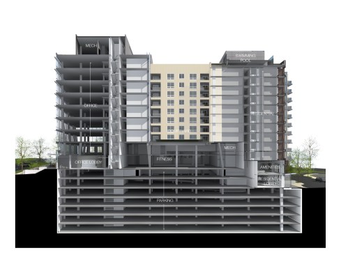 CORE’s team addressed the complicated program involving complex structural and mechanical requirements by applying a 3-D “puzzle” approach more typical for a downtown urban area in order to achieve a cohesive design. The solution involved vertically stacking unrelated elements (residential on top of a large fitness program and parking structure), with a strategically placed structure to achieve the maximum benefit for each individual use. To achieve the continuity of retail and sloping of the street, the retail design draws its inspiration from a hill town mirroring the organic nature of its topography. The ground floor retail is designed to engage the edges of the site, promoting interaction between building tenants and the surrounding environment. To further reduce the effect of vehicular intrusion, the project features only one vehicle entrance above ground while all 744 parking spaces are placed below grade.