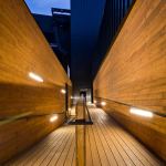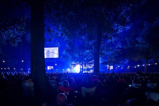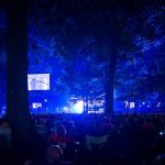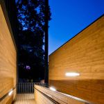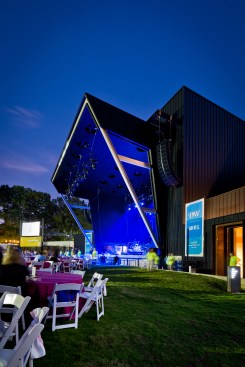 To the south, the Woodland Pavilions lie at the boundary between an old-growth woodland and the venue. They include the stage, an event pavilion, and support areas. They are winding, trapezoidal volumes clad in dark metal siding, receding into the shadows of the tree-line. Entrances to the pavilions are carved into volumes and wrapped in wood siding.