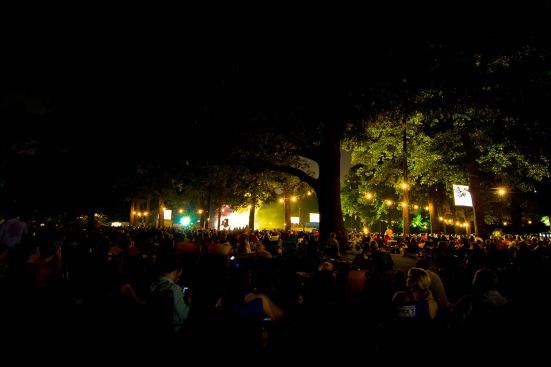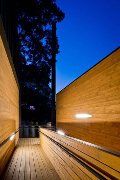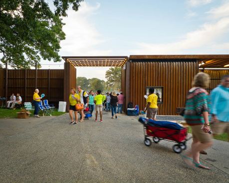 An outdoor room is formed by surrounding a sloping lawn with boundary elements that leverage adjacencies to other programs and the natural features of the site.