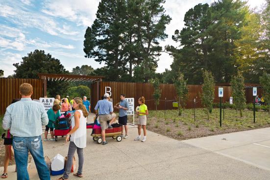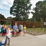 The Living Wall combines weathering steel columns and a flowering hedge, set and pruned to a consistent elevation. It snakes between gardens to the west and the venue lawn. At the lawn’s southwest corner, it turns eastward, bounding the lawn and the Woodland Pavilions. It clarifies circulation, displays unique plant species, and registers the topography of the lawn as it slopes down to the venue stage.