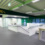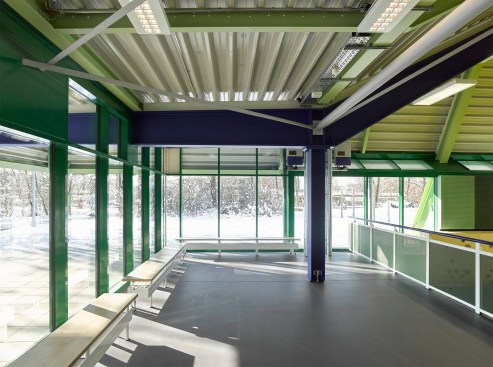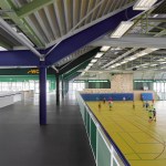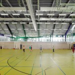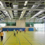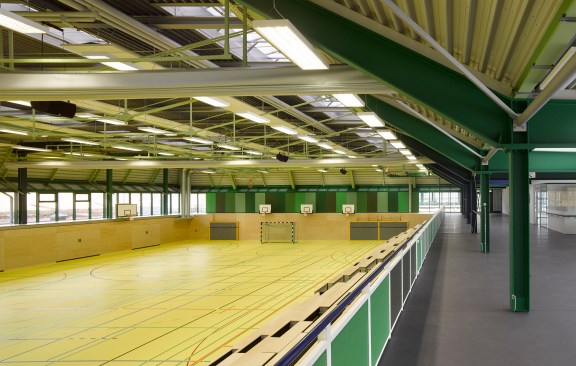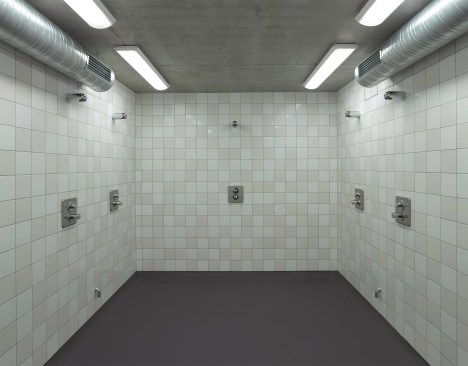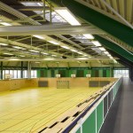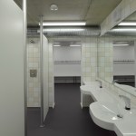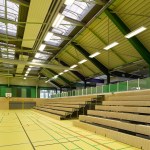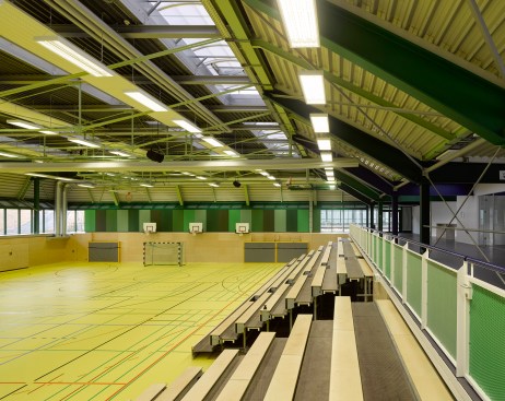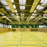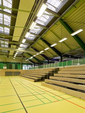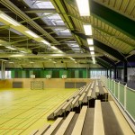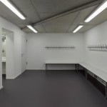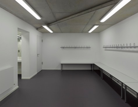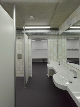 The distance between the existing shower facilities enabled a reorganization of the hall level floor plan. The broad staircase leads visitors into a generous hallway, which connects the sports hall to the locker rooms and – due to its widening in the access areas – allows for a greater freedom of movement. Additional storage space is provided via an additional store room. The six former locker rooms are reduced to four, two each being connected to one sanitary block. All sanitary facilities have been renewed, including a visitor’s lavatory equipped with amenities for guests with disabilities, as well as teacher’s bathrooms and locker rooms. Existing pillar-shaped showers were replaced by separate showers, which are arranged alongside the walls.