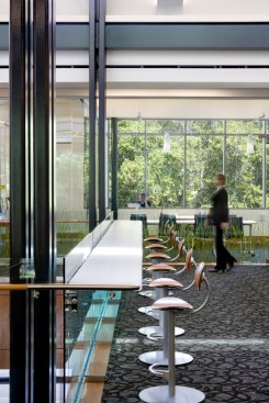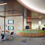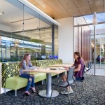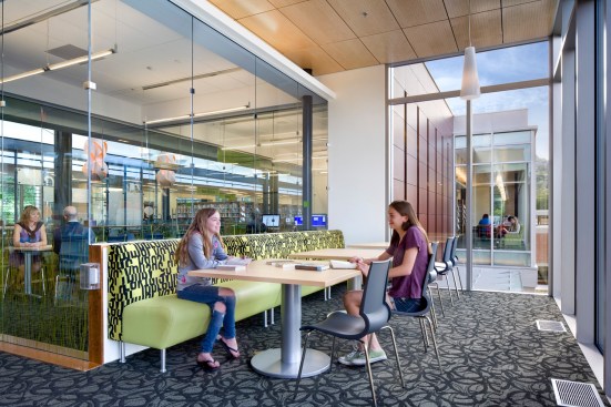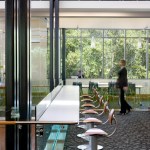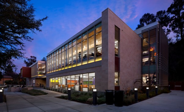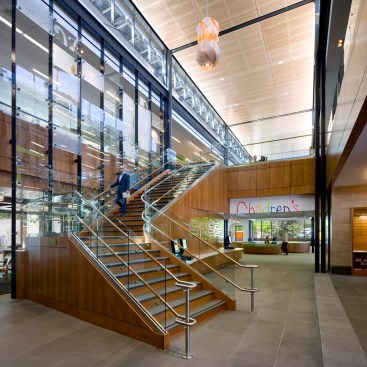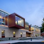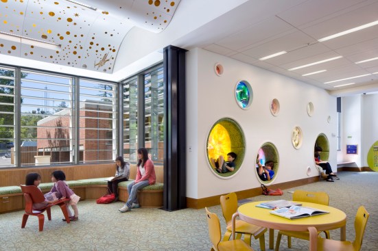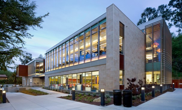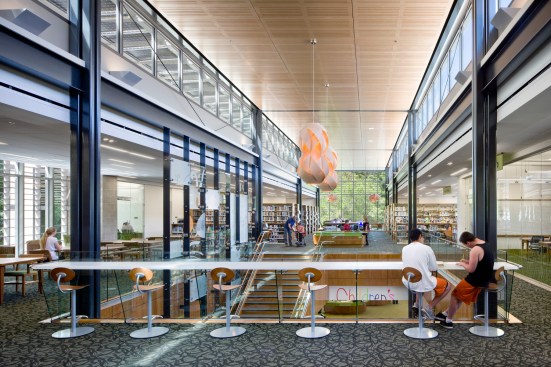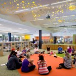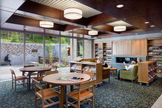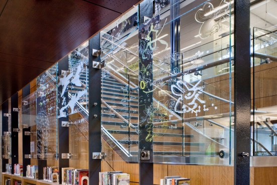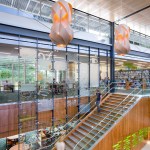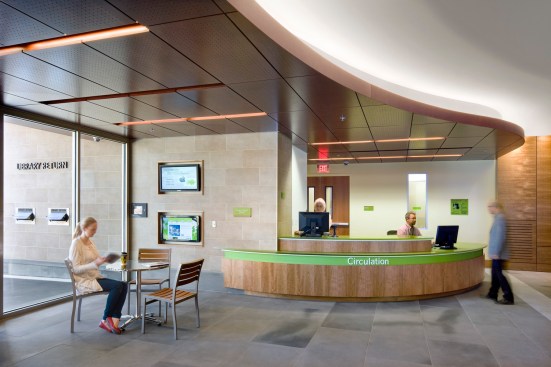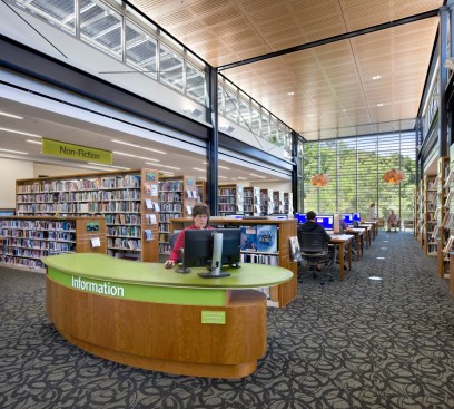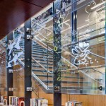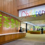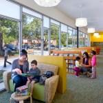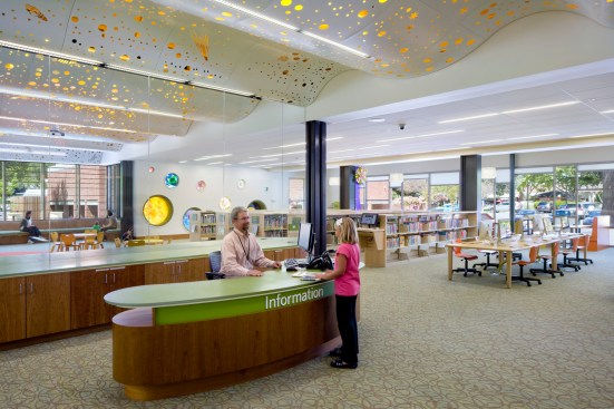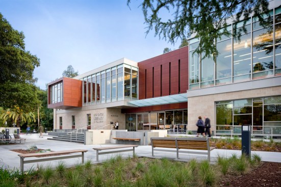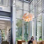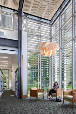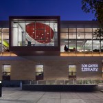 Nestled at the foot of a wooded hillside, the new Los Gatos Public Library is a key element within a master plan that strengthens the connection between the town’s civic center and historic Pageant Park. With its rectangular form, the two-story public library complements the adjacent 1960s Civic Center, an elegant masonry building split into quadrants and located partially below grade. “We wanted to create a connection with, and a contrast to, the existing 1960s-era Civic Center building,” notes Chris Noll, FAIA, Principal in Charge and co-founder of Noll & Tam. The inspiration for the nearly 30,000-square-foot library is a lantern, a welcoming symbol to the community, and a visual play on the rich “enlightened” world within. During the day, glazing on the north and south walls invites sunlight in, creating a warm natural glow. At night, artificial illumination projects outward, turning the library into a beacon that anchors the neighborhood—a literal light in the woods. The 35-foot-high lobby atrium brings in plenty of daylight and features a two-story staircase with symbols of letters, phrases, musical notations, scientific formulas and information mapping etched into two-story translucent glass panels. Custom-designed wood veneer lighting fixtures by Miguel Herranz float in the central space. Visitors enter the children’s library under a glowing rainbow entry sign and find themselves beneath a 75-foot-long illuminated starry sky full of constellations, planets, and spaceships. The curved ceiling panel was fabricated directly from the architects’ digital 3D model and is installed below a ceiling painted yellow and uplighted by linear fixtures. The library’s extensive glazing provides a sense of openness and transparency, while the exterior’s natural hues of concrete, stone, and wood-veneer panels reflect the colors of the surrounding environment. The facility more than doubles the space of its outdated 1960s predecessor. The footprint of the new library was limited by the hillside behind and the desire to preserve mature trees on the site. This led to a simple rectangular form with pop-out design features on the second floor, free from ground constraints and to better capture views. Because of the simple shape of the building, a greater portion of the budget was available for higher-quality materials—exterior tile cladding, wood veneer panels, upscale lighting fixtures, and generous amounts of glass—meeting the client’s goal to create a civic showpiece. The library offers spaces for teens, children, seniors, and history buffs. The cantilever over the entry plaza provides a treehouse-like hangout for teens on the second floor, with a large bay window for visibility. Like the children’s area, the teen area is acoustically separate from the rest of the library. The periodicals reading room has a dark wood-paneled clubby atmosphere complete with a fireplace, and the local history center features custom exhibit cases and a video screen to display artifacts of note. The interior’s maple ceilings reflect warm light into the core of the building. As dusk approaches, fluorescent ceiling fixtures gradually illuminate the expansive window walls, and the lighting from within shines off the glazed facade and exterior wood-veneer composite paneling. A stretch of glass around the exterior of the library at the second floor features integrated color-changing LEDs that subtly move from amber to blue to purple throughout the evening, further animating the building. The building is certified LEED Gold.