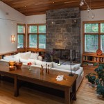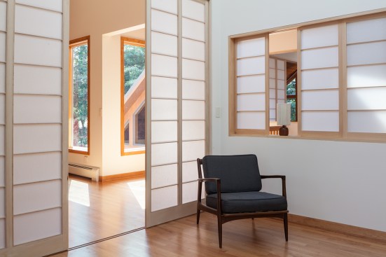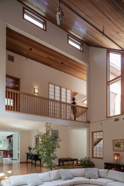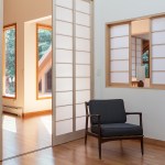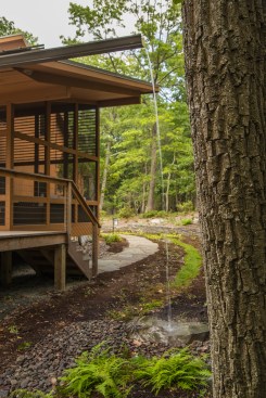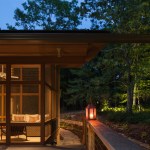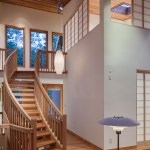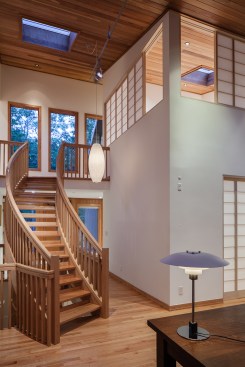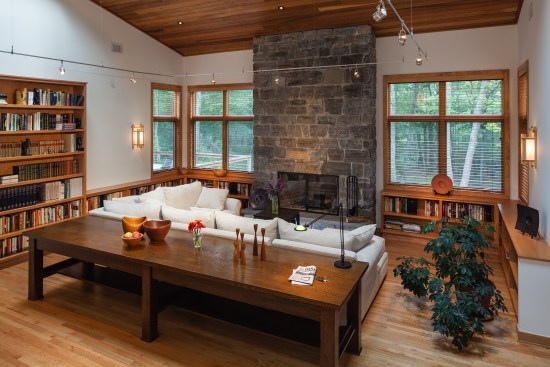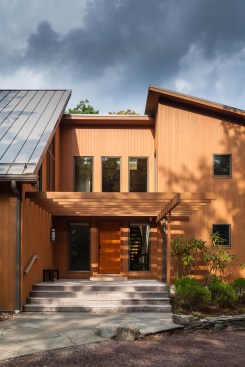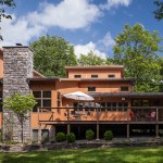 Connection with the natural setting was critical. The views of the forest from inside the house are as important as those from the outdoor spaces. Key features are open continuous space, room transforming shoji screens, abundant natural light, George Nakashima influences, natural materials, a repository for art, literary, and film collections, and stone fireplaces. The lower level is for entertainment with a home theatre, billiard room, wine cellar with tasting area, and exercise room. The house includes fully automated smart systems and remote monitoring capabilities. The well-blended exterior includes vertical cedar siding, standing seam metal roof, and a landscape with native Pennsylvania bluestone walls and paths.