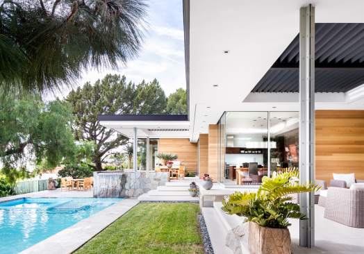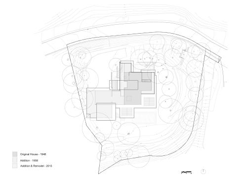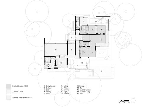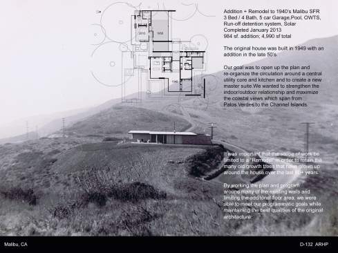 Addition + Remodel to 1940’s Malibu SFR 3 Bed / 4 Bath, 5 car Garage,Pool, OWTS, Run-off detention system, Solar Completed Jan. 13 2013 984 sf. addition; 4,990 sf total The original house was built in 1949 with an addition in the late 50’s. Our goal was to open up the plan and re-organize the circulation around a central utility core and kitchen and to create a new master suite.We wanted to strengthen the indoor/outdoor relationship and maximize the coastal views which span from Palos Verdes to the Channel Islands It was important that the scope of work be limited to a “Remodel” in order to retain the many old growth trees that have grown up around the house over the last 60+ years. By working the plan and program around many of the existing walls and limiting the additonal floor area, we were able to meet our programmatic goals while maintaining the best qualities of the original architecture.