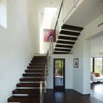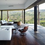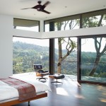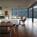 The sequence through the double story entry hall becomes a threshold to the horizontal view of the city where telescoping doors disappear, transforming the living room into an open loft-like space, enclosed but engaged with the landscape beyond. Adjacent to the living room, connected by one of the disappearing glass walls is an additional outdoor room that similarly maintains this balance between enclosure and immersion with the outdoors. The main level is subtly lifted from the ground plane, creating a layer of terracing that extends the topographic shifts of the landscape into the house.