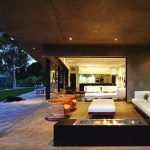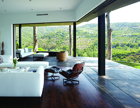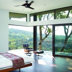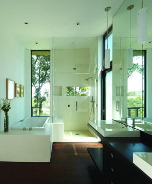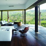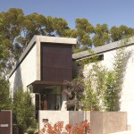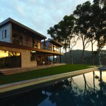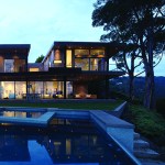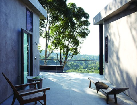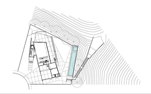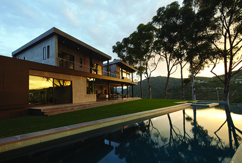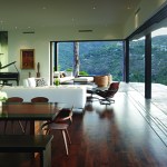 The two shell-like walls shift in plan to differentiate a formal entry and frame the views of the canyon beyond. This volumetric split creates a two-story entry which contains the stair to the second-floor bedrooms. From teh stair hall, a lage opening at the ground level leads to the living area and reveals the expansive vista over-looking the city beyond. The open living, dining, and kitchen areas are surrounded by moveable glass doors that telescope open to the elongated porach. The exterior deck and landscape merge with the topography, creating a lap pool along the site ledge and a stair down to the landscape below. The shift int he volumes of the ifrst and second floor creates coerage for the perimeter deck, providing the sense of enclosure in the exterior space, which in turn connects to the terrain of the site. The second floor is biseted by an open court that separates teh master bedroom from teh childrens’ bedrooms while joining a second floor deck that wraps both volumes. Cantilevering at the corner of the house, the master bedroom views are maximized both up the canyon and towards the city.