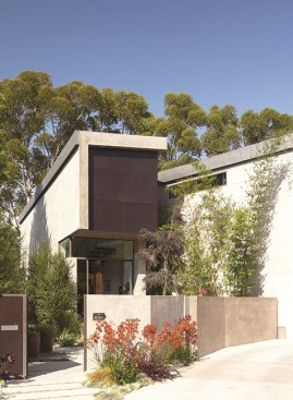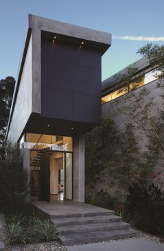 The site for this project is a cul-de-sac that creates a tapered lot and a small curved front yard line, while the rear yard of the site opens to canyon and city views. Two distinct conditions emerge from the design, from the rear yard the house is seen as a series of horizontal volumes that merge with the landscape, while the entrance, at the front, is more vertical and urban. This front-back dichotomy is emphasized byt eh articulation of two vertical walls that fold into roof surfaces to create a backdrop that anchors the horizontal qualities of the terrain.
