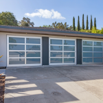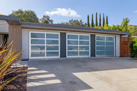 The homeowners of this 1970’s suburban ranch home had modernized their home’s interior to a more minimal, modern style and wanted to apply the aesthetic to the home’s facade. Their goal was to completely transform the exterior, upgrading its blah, pseudo-Spanish ranch style to a bold modern aesthetic. The main objectives were to abandon the arches at the front porch, create a clearly defined entryway with a strong sense of architecture, and give the home more curb appeal with new garage doors and a mix of modern materials such as aluminum, glass and flush-profile siding.