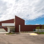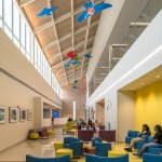 Methodist Le Bonheur Children’s hospital has been serving the west Tennessee, Arkansas, and Mississippi areas for over 50 years, seeking to be the choice provider for children and families in the region. As they gradually outgrew their Jackson, TN location, their focus shifted to create a more functional and visible facility to serve their continually increasing breadth of patients. A site directly off the busy 1-40 interstate corridor proved to be a choice that was easily accessible and high-visibility. The site is surrounded by suburban homes, big box retailers, and car dealerships, making it a necessity for the Outpatient center to stand out amongst the beige, cookie-cutter forms. brg3s Architects and Bottletree Design Group partnered with Le Bonheur to create a space with a minimal budget, The design goals of the pediatric outpatient center were to take an extremely minimal budget and echo the traditional formal language of the surrounding area’s built context while simultaneously giving the building a greater presence from I-40. Making use of the vernacular gable-roof form, cementitious fiber panels, and translucent glazing, a design was composed that would heighten the feeling of comfort to the initial patient approach. The apex of the gable defines the main gallery and waiting function, which acts as the structure’s spine separating the Administrative and Clinical areas. On the clinic side 26 exam rooms are organized along 3 color coded corridors creating a simple circulation path from the gallery and check-in to the exam rooms. Le Bonheur is also known for integrating artwork throughout their clinics and hospitals. brg3s collaborated early on with Memphis-based artist Tylur French to commission some installations that would function specifically within the space, creating a seamless balance between art and architecture. Stepping inside, the visitor is greeted by an open, two-story gallery and waiting room, blanketed with diffused natural light and dappled with splashes of color within the recessed waiting areas. Suspended from the ceiling are flocks of whimsical avian mobiles, some of Tylur’s custom creations. The building all-together seeks to make the visit comfortable and stress-free for patients and their families. A beautiful and functional space will reduce anxiety aiding in swift physical, mental, and emotional recovery. The new Jackson area Le Bonheur Children’s Outpatient Center continues to set precedents as the ever evolving face of children’s healthcare.