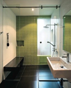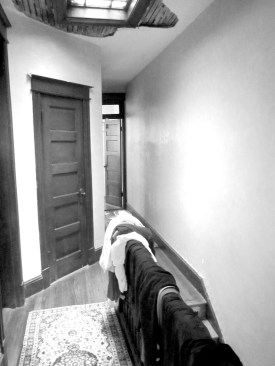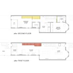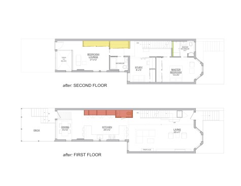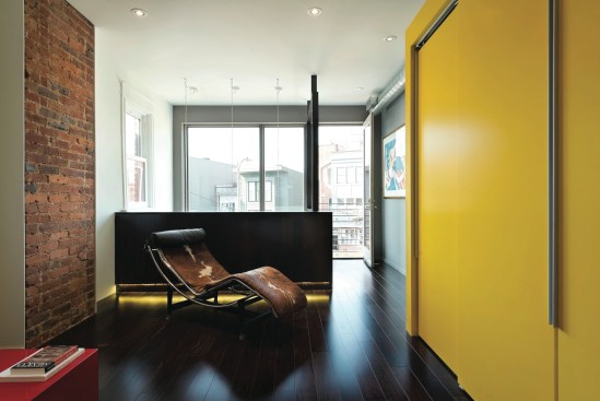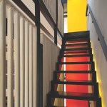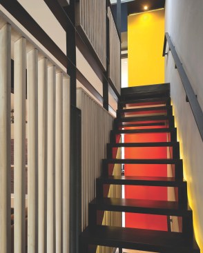 After more than 30 years of traveling and living away from Puerto Rico, Carmen decided she wanted her DC row house to be reminiscent of her island home. The design highlights three key elements: COLOR: Colors used are traditional to Puerto Rico, and the composition acts as a 3-D collage within the house. The east wall is lined with storage elements painted orange and yellow. Other elements are neutral black to contrast the rich colors. The west wall is lined with artwork from Carmen’s collection island artists. LIGHT: Interior walls were removed and large windows installed on the rear facade. Casement windows replaced all the original double hung windows, and light colors highlight surrounding ceilings and walls. MATERIALITY: The living space flooring is white porcelain tile, while the second floor is a dark bamboo. The wood “mampara” screen at the stairs is a white-washed poplar, and is framed with blackened steel. The poplar reappears on the second level and at the rear “bridge,” terminating at the juliette balcony.