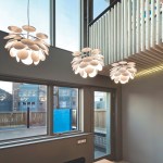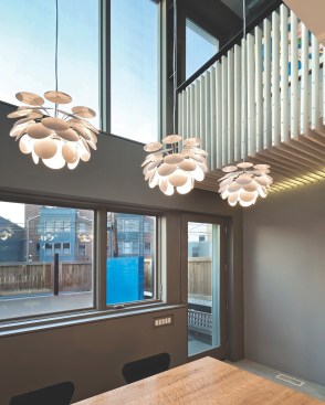 the home, used for flooring, the stairs’ mampara screen, and on pendant light