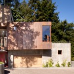 Natural copper is the primary exterior material, wrapping the second floor of the house to emphasize the location of the main living spaces. Walls below the second level are exposed concrete; those above are cement plaster. The interior evokes the feeling of a gallery in the country, with white walls, expanses of glass, and wide-plank oak floors.
