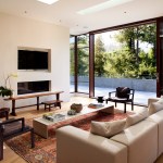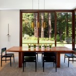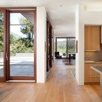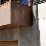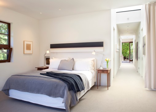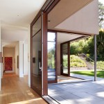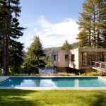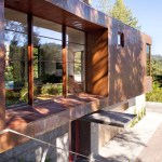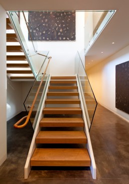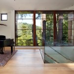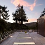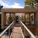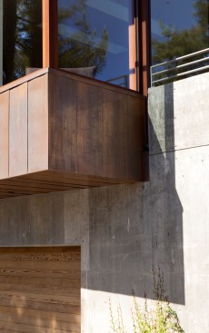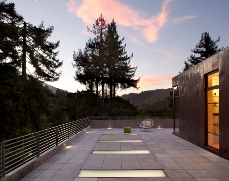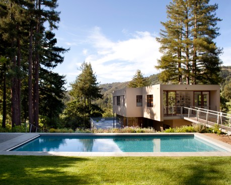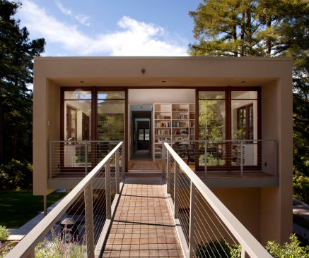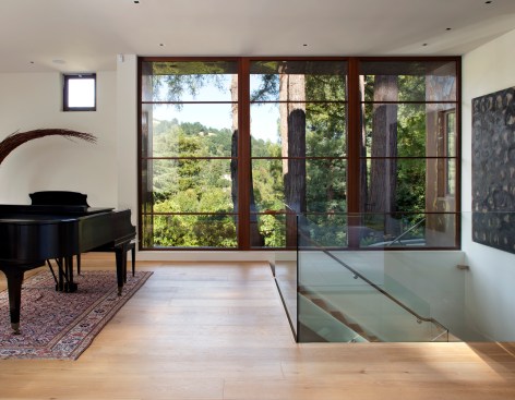 The first floor includes the garage, entry, painting studio, gallery, and guest quarters. The entry is a two-story space with a staircase leading up to the second floor—the main living level–which connects to the outside with views in many directions. This double-height space, the spatial core of the house, has a large bay of windows focused on a grove of redwood trees just 10 feet away. The top floor contains two bedrooms, a home office, and a ramped bridge that leads to an upper yard and pool.